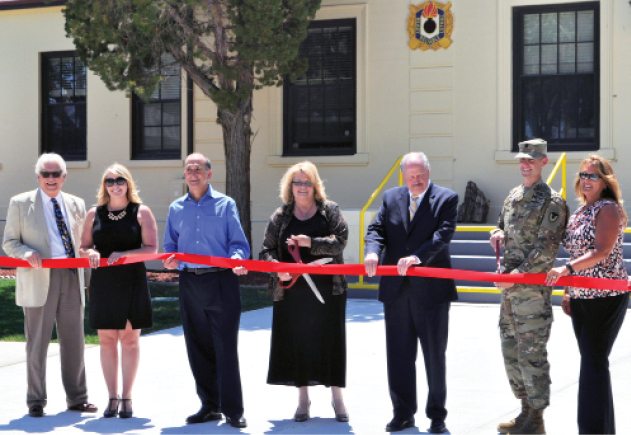 Mineral County Economic Development Authority Director Shelley Hartmann (middle) and Lt. Col. Gregory Gibbons (second from right) prepare to cut a ribbon on the Hawthorne Technology and Industrial center at the Army Depot Tuesday.
