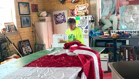 She said, “I enjoy hanging out with Wade at the sign shop, giving back to the community and sewing. It’s a ‘no-brainer’, actually, it’s an honor. I keep an eye on it from my house and watch it and hear it pop when the wind catches it just right.”