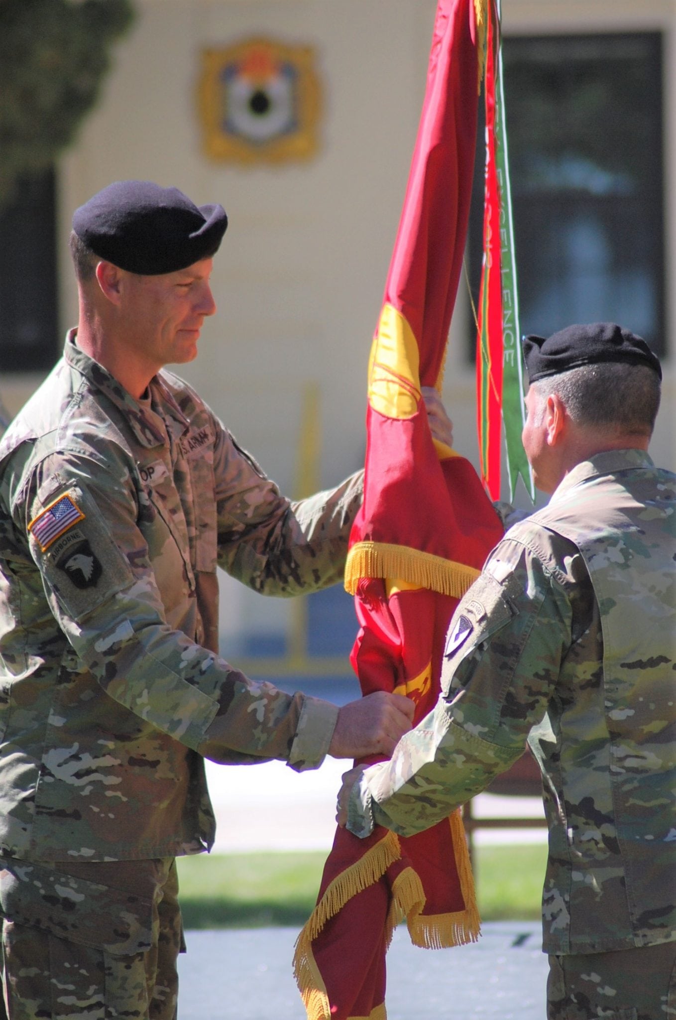 LTC Dustin G. Bishop accepting the flag from COL James L. Brown.