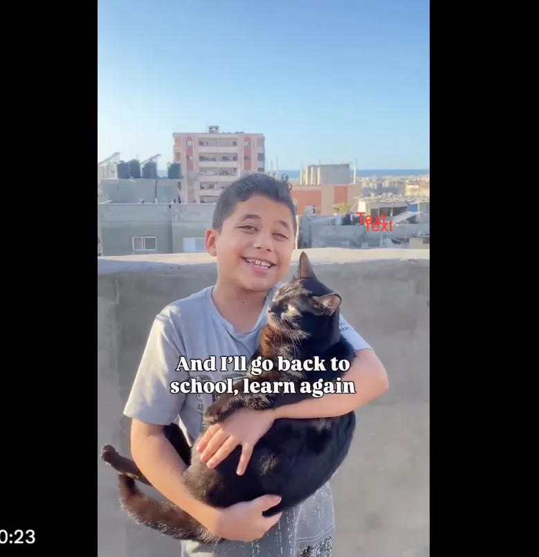 The pictures I’ve seen of Palestinian children celebrating the ceasefire don’t look starving. Here’s a kid who made it to Western news wires. He looks well-fed, holding an even more well-fed cat.